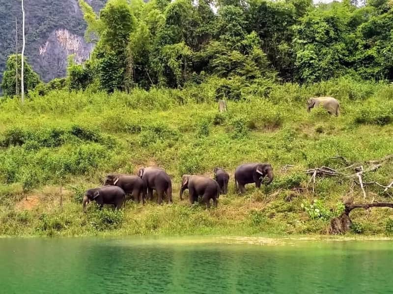 Elephants On A Hillside RiverbankStart your day with a peaceful morning safari by boat on Cheow Lan Lake. As the mist rises over the water, keep an eye out for wildlife like gibbons, hornbills, and other early risers in the jungle.